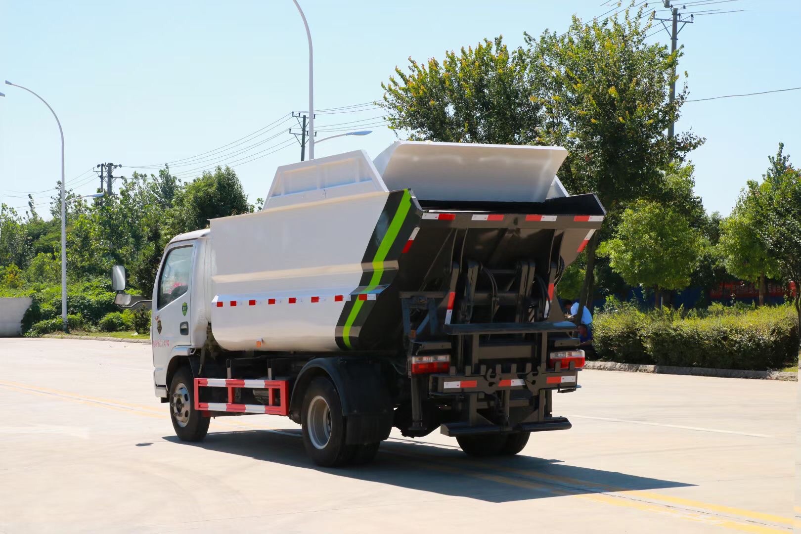 3.1到達垃圾站,伸出支腿,傾翻垃圾箱,打開滑板及刮板,傾倒垃圾。