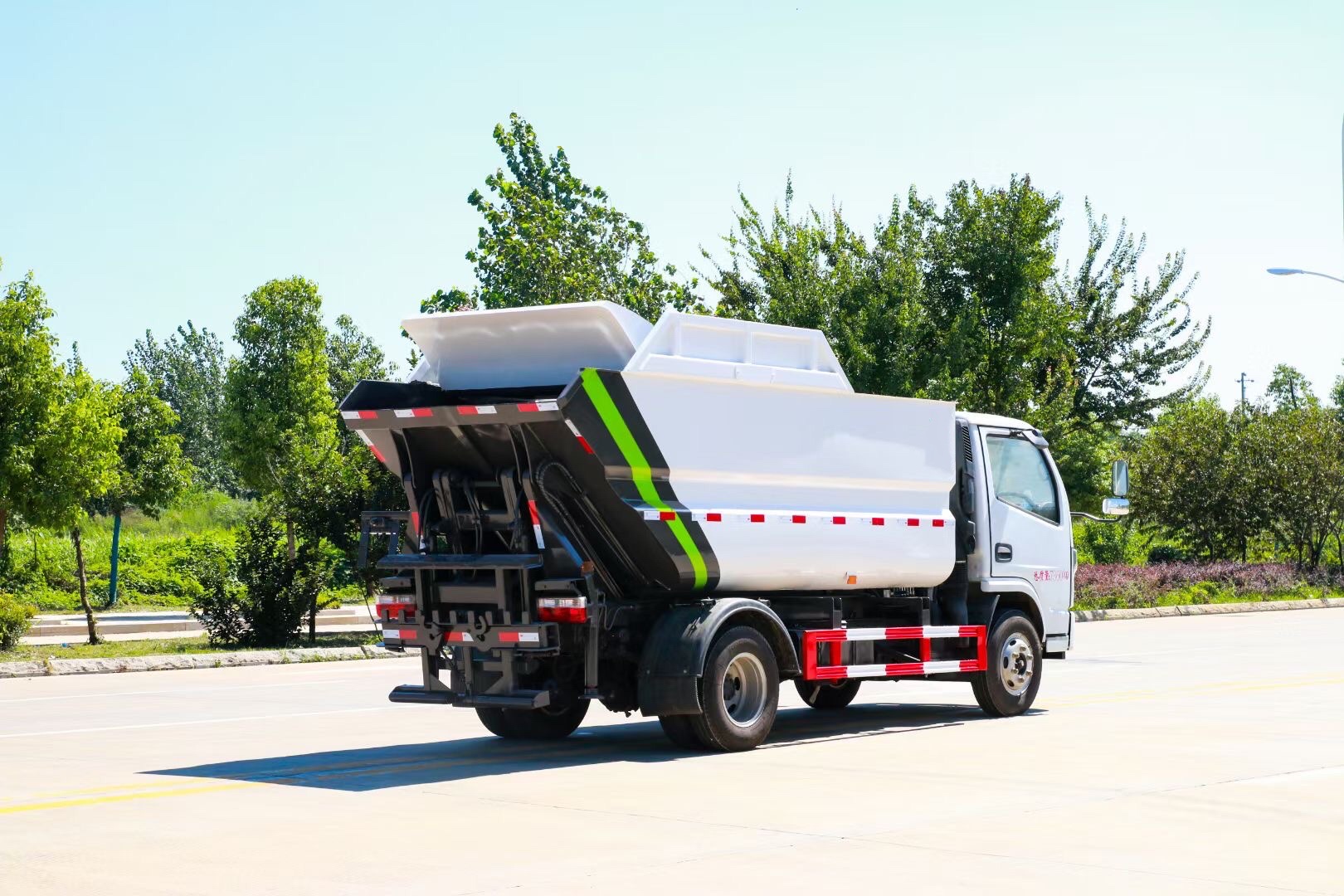 2、高效性:采用結(jié)構(gòu)簡單,性能可靠的后翻轉(zhuǎn)上料機構(gòu),上料機構(gòu)單次上料循環(huán)時間短,運行效率高,在狹窄街道和小區(qū)作業(yè)更加方便,翻桶架和投料口的優(yōu)化設(shè)計避免了上料時的垃圾灑漏。